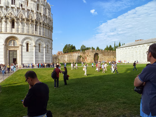 rather than Pisa Centrale (Thank you Rick Steves) which is much closer to the compound where the Leaning Tower, Baptistery, and Duomo are. It was a short walk. There is a bit of a carnival atmosphere because of the crowds of people and the quantity of vendors. It's funny but you get warned off of purchasing from illegal vendors, those that are ambulatory, those without location and license, but while we were walking past a stand we saw the vendor loading up an ambulatory seller. So hmmmmmm?